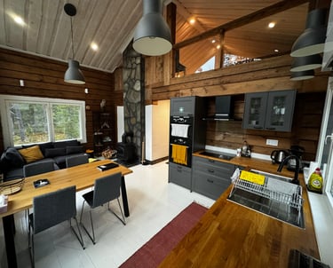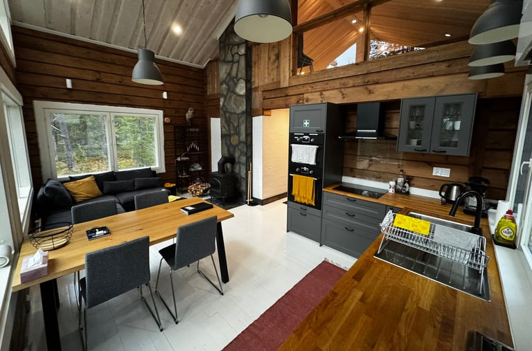 The traditional hand built style with modern spaces and styling makes the best of both worlds. Traditional ventilation gives true silence and fresh arctic air into the spaces. You will enjoy a sense of calm in all the spaces in this cabin!