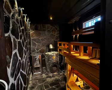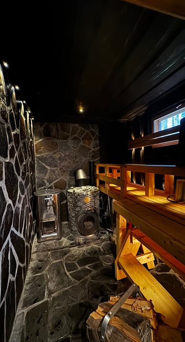 Unwind in our one of a kind rustic Sauna. The walls are hand crafted with slate rockwork and burnt pine panels, creating a rugged yet calming atmosphere. The 300kg of hot rocks cover a roaring wood powered sauna stove creating 'Löyly' comparable to none other. Bath in the traditional Finnish way with water from a fire heated cauldron.